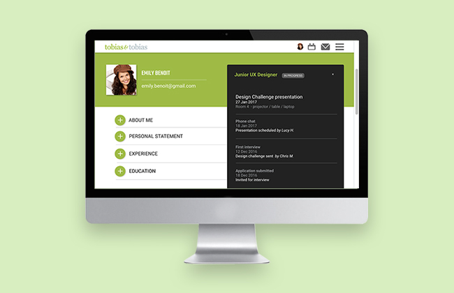 Solution: A recruitment profile page that allows candidates to edit their profiles in different steps, send and receive direct messages and check how their application progresses. The platform also allows hiring managers to easily communicate candidates, assign profile reviews to colleagues and monitor hiring process through a customised dashboard.
